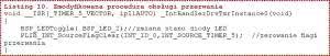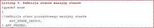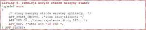 Po zainicjowaniu systemu maszyna stanów przyjmuje stan APP_LED_ON. Kiedy ten stan jest aktywny, to jest sprawdzana wartość najmłodszego bitu zmiennej led. Jeżeli ten bit jest jedynką, to maszyna stanów ustawia linie, do których przyłączono diody LED_1 i LED_2, a potem zmienia stan na APP_ LED_OFF. W stanie APP_LED_OFF jest wykonywane sprawdzenie czy najmłodszy bit zmiennej led jest wyzerowany.