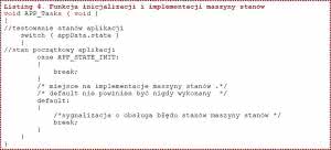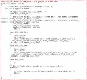 Inicjalizacja aplikacji polega na zdefiniowaniu stanu początkowego maszyny stanów. W pliku app.h jest umieszczona definicja stanu początkowego APP_STATE_INIT. Jeśli użytkownik będzie rozbudowywał swoją aplikację, to musi tu definiować kolejne stany maszyny stanów. Jedną z ważniejszych funkcji w systemie jest funkcja APP_Tasks () umieszczona w pliku app.c. To właśnie w tej funkcji będzie implementowana maszyna stanów. APP_Tasks () jest stale wywoływana w nieskończonej pętli głównej funkcji main().