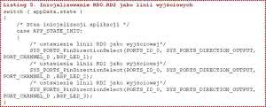 W trakcie inicjalizacji aplikacji jest wprowadzany stan APP_STATE_INIT, w którym ustawiamy linie RD0 (BSP_LED_1) i RD1 (BSP_LED_2) jako wyjścia i na końcu wybieramy stan APP_LED_ON. W następnym cyklu poolingu jest aktywny stan APP_LED_ON i jest wykonywane ustawianie linii RD0 i RD1 przez funkcję SYS_PORTS_PinSet. Po tej czynności jest wprowadzany stan APP_ NOP. Ponieważ w "obsłudze" tego stanu nie zmiany na inny, to maszyna pozostaje w stanie APP_NOP w nieskończoność.