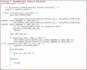 Teraz sobie zdefiniujemy kolejne dwa stany maszyny stanów w pliku app.h (APP_STATES) - listing 6. Stan APP_LED_ON ma za zadanie zaświecenie diody LED. Jeśli uaktywnimy stan APP_NOP, to nasza aplikacja nie będzie nic robiła. W kolejnym kroku modyfikujemy funkcję APP_Tasks dodając kolejne dwa stany, jak na listingu 7.