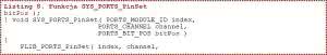 Biblioteka Harmony zawiera wiele funkcji obsługujących układ portów, od konfiguracji kierunku przesyłania danych, poprzez ustawienia typu PULLUP, do czytania stanów linii wejściowych i sterowania liniami wyjściowymi. Dla tak nieskomplikowanych zadań, jak na przykład ustawienie lub zerowanie linii portu, funkcja drivera portu wywołuje tylko funkcję biblioteczną układów peryferyjnych PLIB (listing 8).