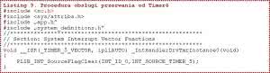 Prostszej, bo konfigurator skonfigurował nam licznik i system przerwań. Procedura obsługi przerwania jest umieszczana w pliku system_interrupt.c (katalog Source Files/app/system_config/default), a funkcje drivera w pliku drv_tmr_static.c (katalog Source Files/app/system_config/default/frmework/driver/tmr/src). Na listingu 9 pokazano procedurę przerwania wygenerowana przez MHC.