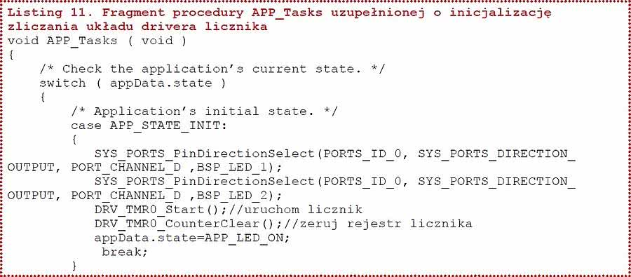 Ponieważ licznik jest 32-bitowy, to nie będzie z tym problemu. Procedurę obsługi przerwania uzupełniamy o funkcję BSP_LEDToggle(BSP_LED_2) negującą przy każdym wywołaniu poziom logiczny linii sterującej diodę LED2 modułu PIC32 USB Starter Kit II (listing 10). Aby całość działała poprawnie, trzeba jeszcze włączyć zliczanie i ewentualnie wyzerować rejestry licznika. Można to zrobić w procedurze APP_Tasks w aktywnym stanie APP_STATE_INIT (listing 11).
