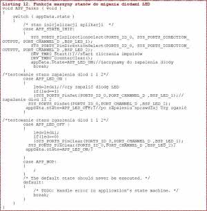 Wykorzystując te funkcje można implementować nieblokujące opóźnienia w maszynie stanów. Ja do celów testowych zaimplementowałem maszynę 2-stanową: APP_LED_ON i APP_LED_OFF. Wykorzystałem tu też mechanizm przerwania do zmiany na wartość przeciwną najmłodszego bitu zmiennej (toogle bit). Wartość tego bitu jest testowana w maszynie stanów i na jej podstawie jest cyklicznie zaświecana lub gaszona dioda LED (listing 12).