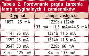 Należy starać się, by zużycie prądu przez odbiornik z lampami zamiennymi było zbliżone do układu oryginalnego. Proponowany sposób zastąpienia lamp spełnia ten warunek. Co prawda lampy zastępcze różnią się prądem żarzenia w stosunku do oryginałów, ale sumarycznie prąd pobierany jest prawie identyczny, jak w odbiorniku z lampami oryginalnymi - tabela 2.