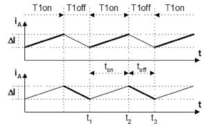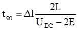 Z uwagi na to, że schemat zastępczy obowiązujący w przedziale załączenia tranzystora pełniącego rolę regulacyjną (rys. 7) jest taki sam dla wszystkich omawianych strategii, czas narastania prądu (ton z rys. 10) jest również jednakowy. Jeśli pominąć rezystancje zaworów oraz rezystancje fazowe silnika, to czas ten opisuje zależność: