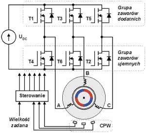 Schemat napędu z silnikiem BLDC w typowej konfi guracji zaprezentowano na rysunku 1. Wyróżniono na nim dwie grupy zaworów komutatora elektronicznego: grupę zaworów dodatnich oraz grupę zaworów ujemnych. W każdej z nich jedna z elektrod tranzystora jest odpowiednio dołączona - do dodatniego lub ujemnego bieguna źródła napięcia zasilania.