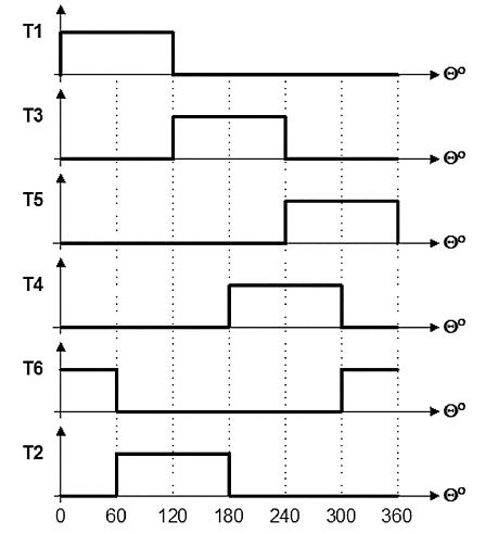 Rysunek 2. Ogólna sekwencja przełączeń zaworów komutatora elektronicznego dla klasycznych strategii sterowania silnikiem BLDC