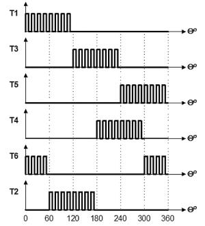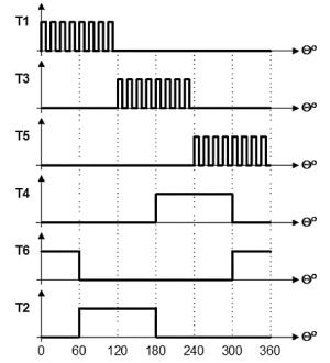 W pierwszym, kąt pełnienia funkcji regulacyjnej przez jeden z tranzystorów wynosi 120° elektrycznych (te strategie oznacza się symbolem 120). W drugim przypadku każdy tranzystor pełni funkcję regulacyjną przez okres 60° elektrycznych - przez okres pozostałych 60° funkcję regulacyjną przejmuje zawór z grupy przeciwnej (te metody sterowania oznacza się symbolem 60).