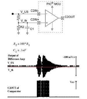 Gdy tylko odebrany zostanie impuls ultradźwiękowy, wartość na wejściu C2IN- spadnie poniżej wartości napięcia C2IN+, powodując przełączenie wyjścia komparatora. Wartość rezystora R2 (rys. 4) powinna być znacznie większa niż R1, ale nie nazbyt duża, by sam szum na wejściu komparatora nie powodował przełączeń wyjścia.