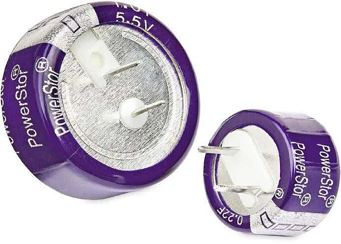 Fotografia 5. Superkondensatory. Mniejszy z przedstawionych jest w stanie zgromadzić energię 0,99 J przy napięciu 3 V, 2,75 J przy napięciu 5 V i 3,33 J przy napięciu znamionowym (5,5 V). Nawet jeśli wykorzystywać tylko energię pełnego kondensatora, ale przy założeniu że napięcie na nim nie może być niższe niż 3 V, wystarczyłaby ona na 22330 cykli pomiarów w przedstawionym przykładzie, a więc na 15 dni pracy (bez zewnętrznego źródła energii) z przesyłaniem wyników co 1 minutę