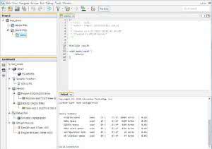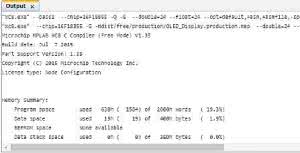 Okno Output zawiera komunikaty generowane w trakcie kompilowania. Można tu zobaczyć zajętość wszystkich rodzajów pamięci mikrokontrolera i ewentualne komunikaty o błędach kompilacji.