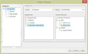Kiedy klikniemy na ikonkę Project Properties okna Dasboard otwiera się okno właściwości projektu, w którym można zmienić, na przykład: typ mikrokontrolera, wybrać dostępną wersję kompilatora i jego ustawienia, wybrać programator (rysunek 5).