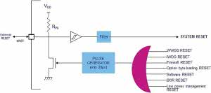 W przypadku pierwszego wariantu mogą to być: peryferia (watchdog, firewall), zmiana w obszarze Option bytes, reset programowy (z poziomu aplikacji), Brown Out Reset (spadek napięcia zasilania) lub wybudzenie z trybu uśpienia. Drugi wariant przewiduje podanie sygnału z zewnątrz, poprzez wyprowadzenie NRST. Schemat bloku zerowania pokazano na rysunku 2.