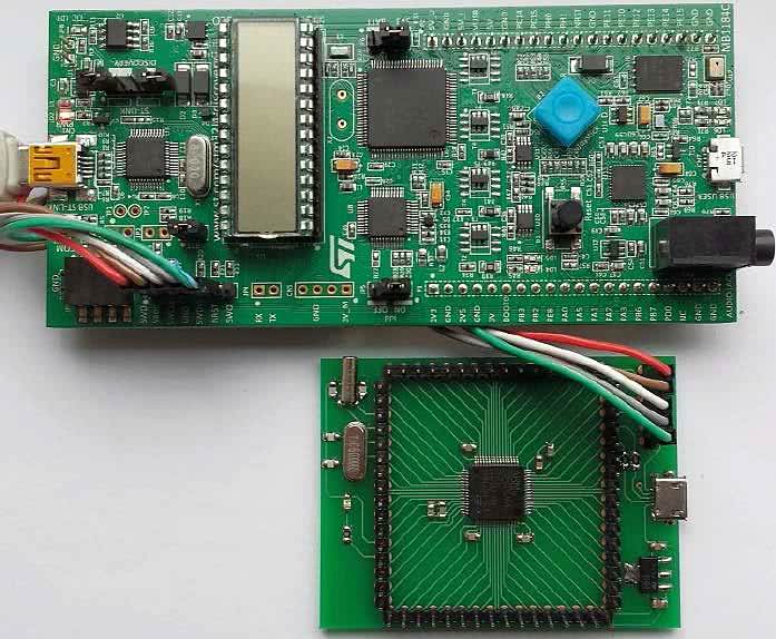 Fotografia 5. Widok płytki prototypowej połączonej za pomocą interfejsu SW-DP do zestawu 32L476GDISCOVERY