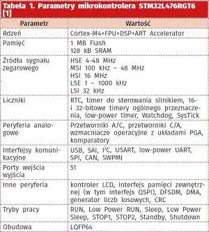 Szczegółowe parametry zastosowanego na płytce mikrokontrolera STM32L476RGT6 przedstawiono w tabeli 1. Warto odnotować, że wskazany układ nie jest jedynym modelem, który można użyć na płytce. Jeśli zajdzie taka potrzeba, mikrokontroler STM32L476RGT6 można zastąpić innym układem, co jest możliwe dzięki kompatybilności rodziny STM32 pod względem układu wyprowadzeń.