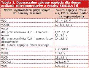 Domeny zasilania w mikrokontrolerach z rodziny STM32 L4 zostały pokazane w sposób graficzny na rysunku 1. Dopuszczalne zakresy napięć zasilających te domeny wypisano w tabeli 2.