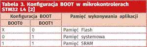 Jest to bit nBOOT1 w przestrzeni Option bytes. Konfiguracje BOOT i przypisane im pamięci wykonywania aplikacji pokazano w tabeli 3. Płytka została zaprojektowana w taki sposób, aby mikrokontroler wykonywał aplikację z pamięci Flash. W tym celu wyprowadzenie BOOT0 zostało podłączone do masy.