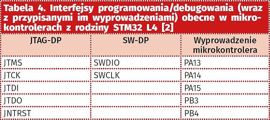 Tabela 4. Interfejsy programowania/debugowania (wraz z przypisanymi im wyprowadzeniami) obecne w mikrokontrolerach z rodziny STM32 L4 [2]