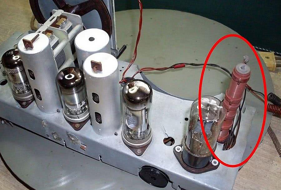Fotografia 1. Radioodbiornik "Pionier" Zakładów Radiowych Diora. Kolorem czerwonym zaznaczono "słupek redukcyjny"