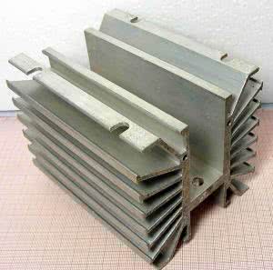 Największą popularnością cieszą się radiatory żeberkowe oraz o kształtach oznaczanych literami Y, U, H. Przykładowe radiatory o tych kształtach pokazano na fotografiach 3...5. Wiele z gotowych, dostępnych w handlu radiatorów, jest przystosowanych do konkretnego typu obudowy, np. TO-220, albo przeznaczonych do podzespołów konkretnego typu, takich jak tyrystory, diody prostownicze, triaki, tranzystory mocy i inne. Gdy radiator nie mieści się w obudowie, na przykład ma wymiary ograniczone przez możliwość montażu na standardowej płycie głównej komputera, to można zastosować tzw. ciepłowody mogące jednocześnie pełnić rolę elementów mocujących dodatkowy radiator. Przykład takiego rozwiązania zastosowanego w karcie graficznej Radeon 9000XT pokazano na fotografii 6.