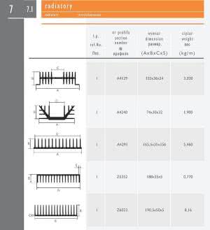 Wielu producentów radiatorów oferuje radiatory o specyficznych kształtach, czasami mających za zadanie jedynie wyróżnienie jego oferty i trudno znaleźć merytoryczne argumenty, które by wykazywały przewagę danego kształtu żeberek nad innymi. Dawniej za nowość uznawano radiatory szpilkowe, jednak raczej nie można stwierdzić, że ich opracowanie cokolwiek zmieniło na rynku radiatorów. Mam wrażenie, że wiele radiatorów - zwłaszcza w komputerach PC - jest wykonywanych bardziej "dla oka", w formie, która ma zachęcić do ich zakupu zwolenników gadżetów. Przykłady takich rozwiązań pokazano na fotografii 7 i fotografii 8. Mają one po prostu dobrze prezentować się, co dla niektórych urządzeń również może mieć bardzo duże znaczenie. Za tą tezą przemawia fakt, że cały czas na rynku dostępne są profile aluminiowe produkowane przez polskiego producenta - Grupę Kęty. Nie zmieniły one swojej formy od przynajmniej 30 lat, a może i dłużej. Na rysunku 9 pokazano stronę zaczerpniętą z katalogu firmy Grupa Kety, na której są pokazane wspomniane kształtki. Przeglądając jednak wspomniany katalog trzeba stwierdzić, że to maleńki ułamek oferty firmy, która rozwija się zupełnie w innym kierunku.
