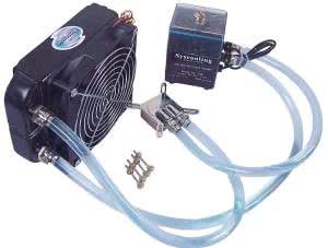 Wraz ze wzrostem szybkości pracy mikroprocesorów, przede wszystkim producenci płyt głównych do komputerów PC prześcigają się w różnych opracowaniach tego typu (fotografie 14 i 15). Podstawową wadą takiego systemu chłodzenia jest konieczność zachowania jego szczelności przy jednoczesnym dopasowaniu do wymiarów obudowy czy urządzenia. Taki komfort mają przede wszystkim konstruktorzy urządzeń wytwarzanych w wielu tysiącach sztuk, gdzie koszty opracowania niejako "rozkłada się" na poszczególne, wyprodukowane egzemplarze, albo konstruktorzy bardzo drogich urządzeń na przykład znajdujących zastosowanie w energetyce. Za pomocą chłodzenia tego typu można oddzielić odbieranie ciepła od jego rozpraszania. Pozwala to na znaczne odsunięcie od siebie obu tych miejsc i uniknięcie niedogodności związanych z hałasem wytwarzanym przez wentylatory wymuszające przepływ powietrza lub pompę powodującą przepływ cieczy w instalacji. Ale nic za darmo. Owszem, systemy chłodzenia cieczą charakteryzują się największą wydajnością, zwłaszcza przy zastosowaniu nowoczesnych płynów chłodzących na bazie glikoli, ale jednocześnie są rozwiązaniem kłopotliwym i rozbudowanym technicznie, wymagającym okresowej wymiany lub obsługi, a tym samy drogim nie tylko w budowie, ale i w eksploatacji.