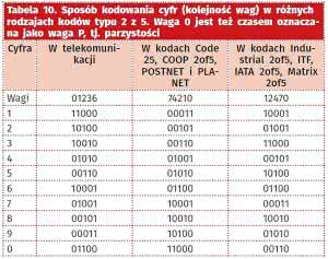 Tabela 10. Sposób kodowania cyfr (kolejność wag) w różnych rodzajach kodów typu 2 z 5. Waga 0 jest też czasem oznaczana jako waga P, tj. parzystości