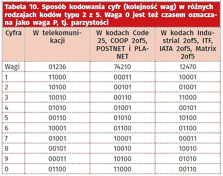 Znaczenie symboli kodu "2 z 5", stosowanego powszechnie w technice, zostało przedstawione w tabeli 10. W skrócie: każda cyfra dziesiętna jest zapisywana na pięciu bitach, z czego dwa są jedynkami, a pozostałe to zera. Wartość cyfry zależy od pozycji jedynek, które to pozycje odpowiadają dodawanym do siebie wagom, zgodnie z tabelą 10. Jedynki mogą być kodowane jako czarne paski szerokie, a zera jako czarne paski wąskie (najczęściej 2-3-krotnie węższe niż szerokie). Oczywiście, pomiędzy paskami czarnymi konieczne jest umieszczenie cienkich pasków białych, by te czarne się ze sobą nie zlewały. Tak wydrukowany kod nie zawiera znaków startu i kodu ani cyfry kontrolnej, więc jego odczyt, choć cechuje się dużą