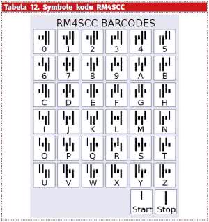 Kody kreskowe są powszechnie stosowane w sortowniach pocztowych. Oprócz wymienionych już standardów POSTNET, PLANET, Chinese 25, Identcode (rysunek 29) i Leitcode (rysunek 30), na rynku funkcjonuje jeszcze kilka innych. Kody paskowe opracowane na potrzeby poczty, ze względu na to, że są nadrukowywane na korespondencję, cechują się najczęściej delikatnym wyglądem i mogą znaleźć zastosowanie też tam, gdzie kod powinien nie być zbytnio widoczny. Co więcej, często są nadrukowywane słabo widocznym dla gołego oka, ale fluorescencyjnym tuszem, by można je było odczytać przy odpowiednim świetle.