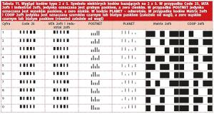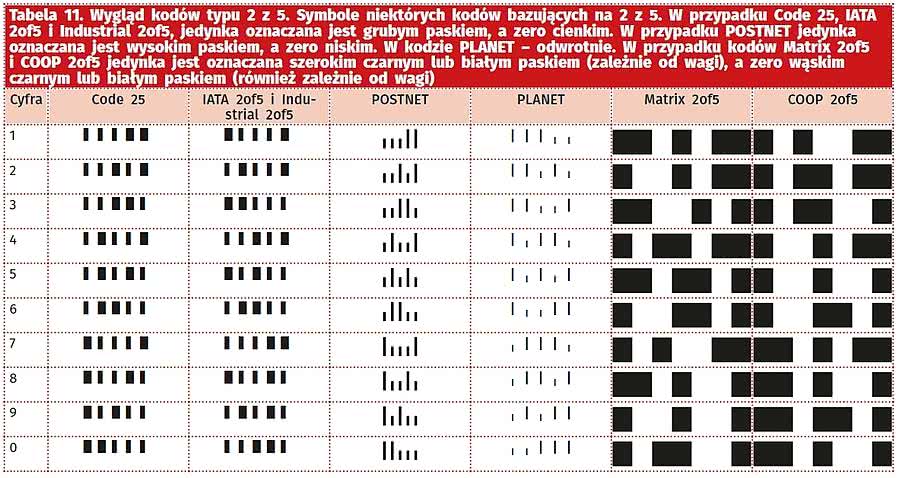 Tabela 11. Wygląd kodów typu 2 z 5. Symbole niektórych kodów bazujących na 2 z 5. W przypadku Code 25, IATA 2of5 i Industrial 2of5, jedynka oznaczana jest grubym paskiem, a zero cienkim. W przypadku POSTNET jedynka oznaczana jest wysokim paskiem, a zero niskim. W kodzie PLANET - odwrotnie. W przypadku kodów Matrix 2of5 i COOP 2of5 jedynka jest oznaczana szerokim czarnym lub białym paskiem (zależnie od wagi), a zero wąskim czarnym lub białym paskiem (również zależnie od wagi)