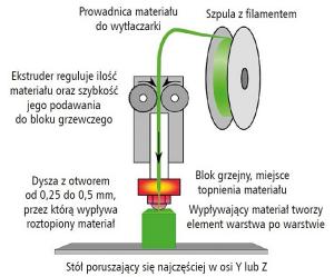 Polega na warstwowym osadzaniu stopionego materiału za pomocą mechanicznej, nagrzewającej się dyszy. Termoplastyczny materiał dostarczany jest w postaci szpul, które umieszczane są w zasobniku drukarki, a jeden z końców materiału nawiniętego na szpulę wprowadzany jest do głowicy drukującej. Ta nagrzewając się podgrzewa go do charakterystycznej dla niego temperatury topnienia, po czym rozprowadza tworząc kolejne warstwy drukowanego przedmiotu.