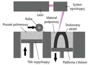 Do technologii SLA podobna jest technika SLS (Selective Laser Sintering), gdzie płynną żywicę zastępuje się proszkiem polimerowym. Kolejne warstwy są tworzone w ten sam sposób, jak w przypadku SLA, z tą różnicą że konieczne jest doprowadzenie nowego materiału na wierzch drukowanego obiektu. W przypadku ciekłej żywicy, nowy materiał napływa sam, a w SLS używany jest do tego mechanizm rozprowadzający, układający nowe warstwy, które następnie są spiekane laserem w odpowiednich miejscach.