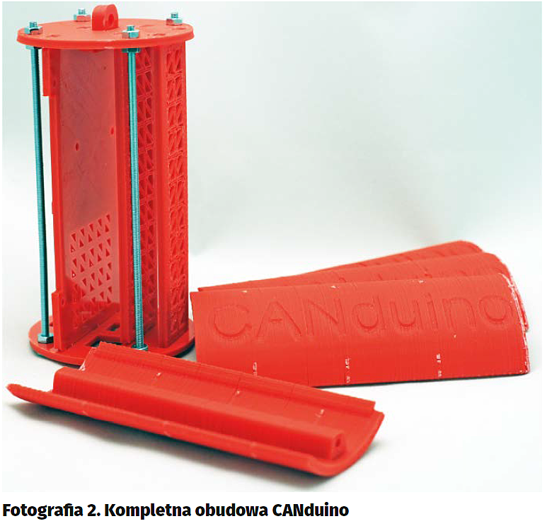 Aby urządzenie było kompletne, należy je umieścić w odpowiedniej obudowie. Drukarki 3D pozwalają na drukowanie niemal dowolnych kształtów, ale mają swoje ograniczenia (fotografia 1). Obudowa CANduino wymaga precyzyjnego dopasowania, dlatego elementy drukowane są z dodatkowymi różnymi elementami, jak wsporniki, które ułatwiają proces drukowania i przed montażem należy wszystkie te naddatki usunąć. Dobrze jest końcowe elementy dopasować ręcznie z użyciem takich narzędzi, jak pilnik i drobnoziarnisty papier ścierny, aby dopasowanie było idealne. Ważne jest też sprawdzenie drożności otworów, przez które przechodzą 4 główne śruby mocujące i ewentualnie rozwiercić je wiertłem 3 mm. Na koniec warto przykleić ucho do mocowania spadochronu do górnej pokrywy i całość złożyć w celu sprawdzenia (fotografia 2).
