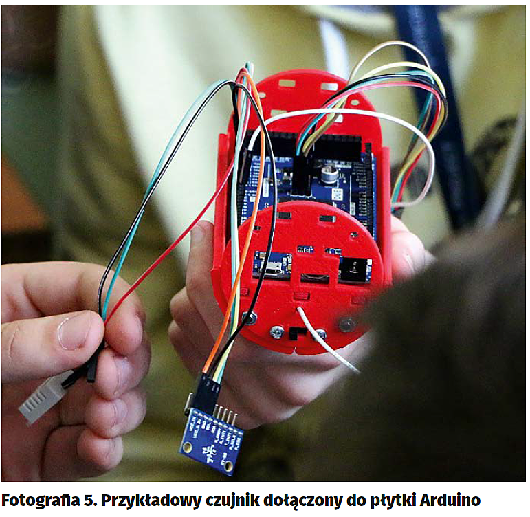 Gdy komputer działa prawidłowo, czas na uruchomienie nadajnika radiowego. W tym celu odłączamy CANduino od komputera, otwieramy obudowę i odłączamy baterię. Za pomocą kabli do łączenia goldpinów łączymy moduł CC1000PP z płytką DUE zgodnie ze schematem. Piny na module CC1000PP będzie trzeba „delikatnie” pozaginać, aby możliwe było potem zamknięcie obudowy. Podobnie można dołączyć inne moduły czujników, które potem mocujemy do dodatkowych mostów obudowy. Całość jest tak pomyślana, aby łatwa była zmiana konfiguracji, a jednocześnie, aby można było mocować dowolne czujniki/płytki (fotografia 5). Dlatego też, zamiast otworów montażowych na płytki czujników, stosuje się opaski zaciskowe, taśmę klejącą oraz przewody połączeniowe. Bardziej zaawansowani użytkownicy powinni rozważyć lutowanie kabelków bezpośrednio do płytek zamiast korzystać z goldpinów. Ograniczy to zajmowane miejsce w obudowie, a także wpłynie na pewność połączeń.