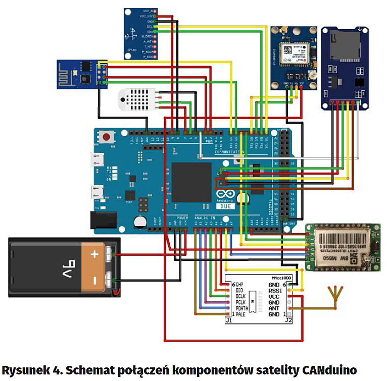 Kiedy lutowanie jest skończone, możemy rozpocząć montaż. Pierwszą czynnością powinno być przykręcenie włącznika zasilania do obudowy oraz przymocowanie modułu CC1000PP do głównego „mostu” w obudowie za pomocą opaski zaciskowej oraz wypuszczenia przewodu tworzącego antenę przez otwór obok wyłącznika. Moduł CC1000PP montujemy przed komputerem, ponieważ później dostęp do otworów na pasek zaciskowy będzie utrudniony. Kolejnym etapem jest przygotowanie plastikowych słupków dystansowych do mocowania płyty komputera. Należy usunąć dwa boczne listki kołka, aby zatrzask prawidłowo mógł zatrzasnąć się w głównym moście obudowy. Przygotowane 4 kołki wkładamy w otwory na moście głównym i na nich zatrzaskujemy komputer pokładowy. Teraz możemy na próbę dołączyć baterię i zamknąć obudowę, aby sprawdzić czy wszystko pasuje. Taki zestaw możemy również podłączyć już do komputera. Warto sprawdzić czy kabel micro USB daje się podłączyć do płytki Arduino. Jeśli jest zbyt szeroki, za pomocą noża, należy nieco usunąć plastikowej izolacji złącza micro USB na kablu. Prawidłowo dopasowany kabel podłączony do CANduino (w Due do złącza środkowego) i do komputera powinien spowodować wykrycie przez komputer nowego urządzenia. Kompletnego, zmontowanego satelitę CANduino pokazano na fotografii 3, a schemat połączeniowy jego komponentów na rysunku 4.