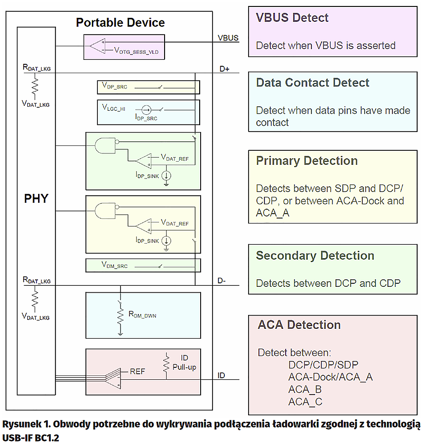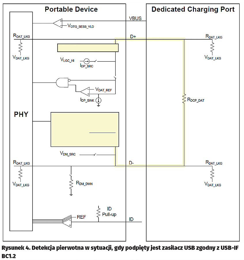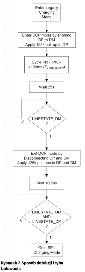 Jeśli podłączone zostanie urządzenie zgodne ze specyfikacją USB-IF BC1.2, pobierany przez nie prąd będzie na tyle duży, że na linii D– pojawi się niskie napięcie. Jednakże urządzenia zgodne z innymi standardami szybkiego ładownia także są w stanie obniżyć napięcie na linii D– do podobnego poziomu. Dlatego cała procedura decydowania o trybie ładowania musi uwzględniać zwieranie linii D+ i D– z podciąganiem D+ za pomocą rezystora 125 kV z określonymi opóźnieniami, co pozwala szczegółowo rozpoznać dopuszczalne tryby ładowania. Zostało to przedstawione na rysunku 7.