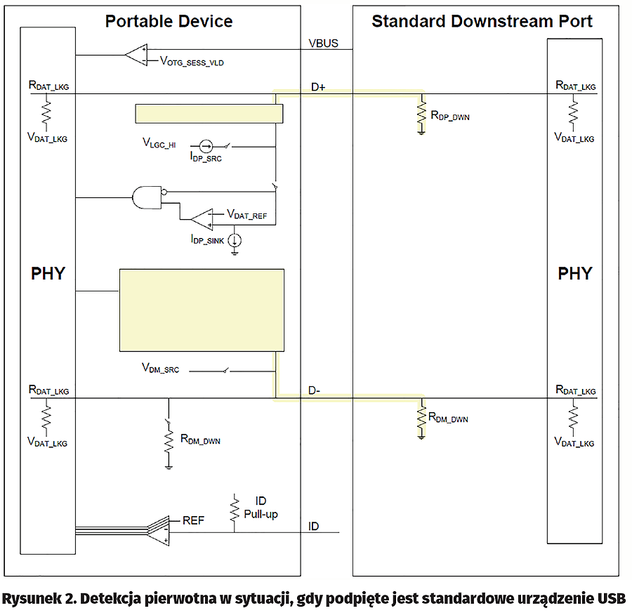 Jeśli urządzenie zostanie podłączone do kompatybilnego zasilacza, na linii D– pojawia się napięcie większe niż VDAT_REF, a rezystancja pomiędzy D+ a D– nie przekracza 200 V.
