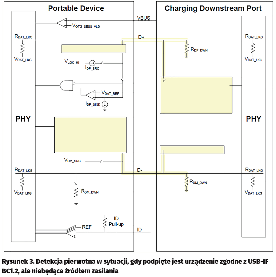 W przypadku podłączenia do urządzenia, które może być szybko ładowane, ale samo nie służy do dostarczania prądu, na linii D+ napięcie będzie wyższe niż VDATA_REF oraz włączone zostanie źródło prądowe oznaczone na rysunku 3 jako VDM_SRC, co spowoduje podniesienie napięcia na linii D–, a więc przekroczy ono VDATA_REF.