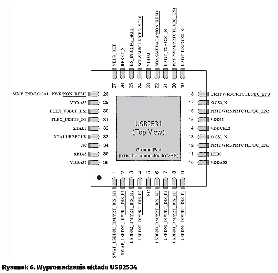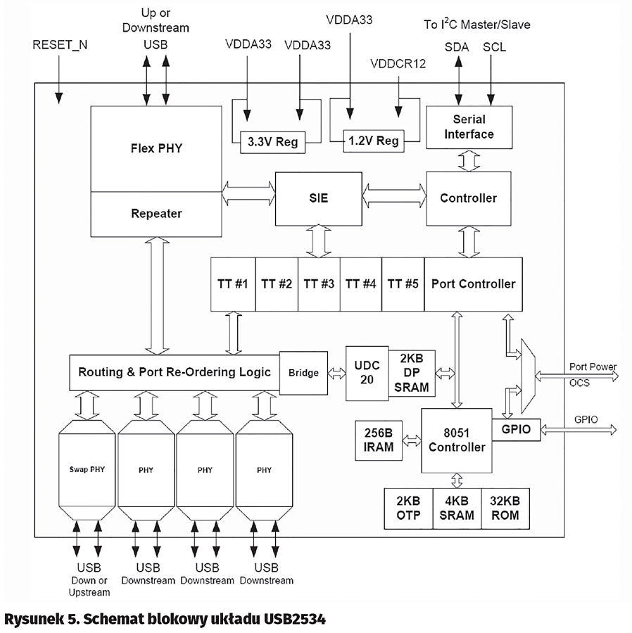 USB2534 jest w stanie samodzielnie, automatycznie wykryć, do jakiego rodzaju ładowarki jest podłączony oraz pozwala na pracę interfejsu USB w klasyczny sposób. Zawiera cztery porty USB w ramach wbudowanego koncentratora oraz jeden do podłączenia z wyprowadzeniami USB mikrokontrolera lub innego urządzenia (rysunek 5). Wśród portów koncentratora tylko jeden może być wykorzystywany do podłączenia ładowarek, przy czym wszystkie mogą służyć jako zwykłe porty USB. Wszystkie 4 porty można także skonfigurować w roli wyjścia ładowarki USB przez odpowiednie dołączenie rezystora podciągającego o wartości 10 kV.