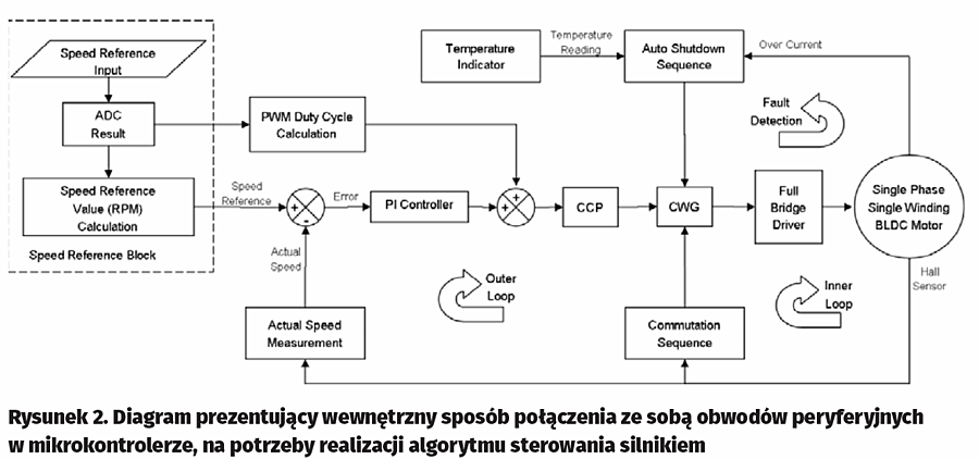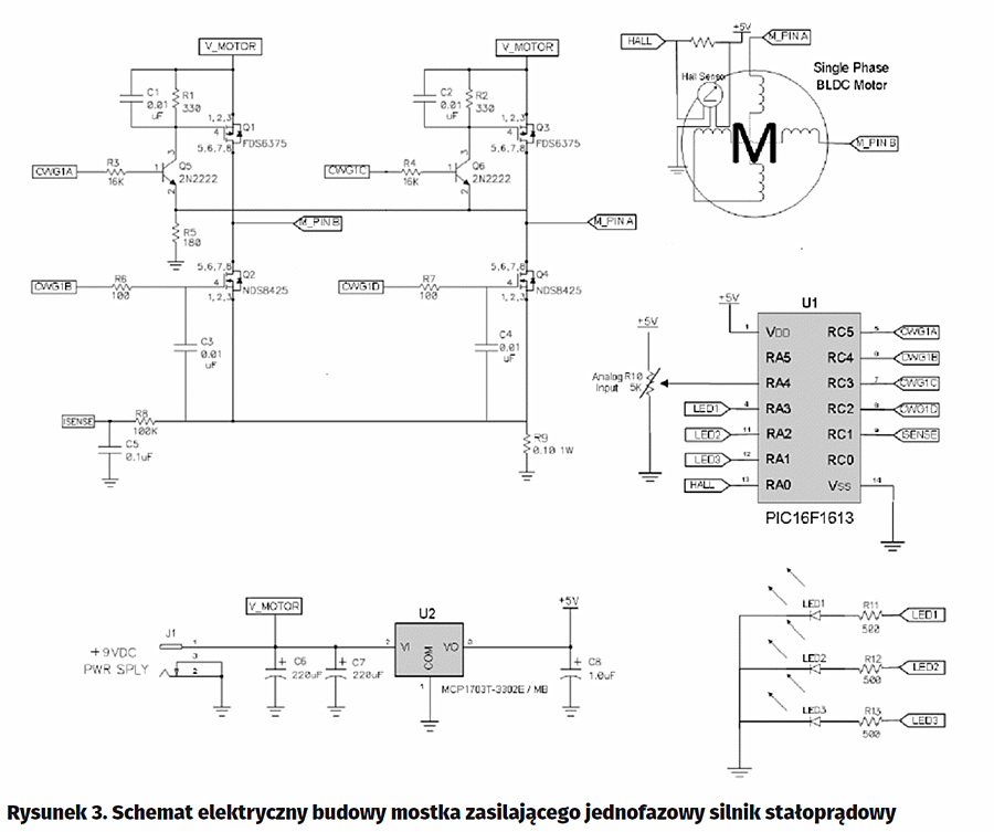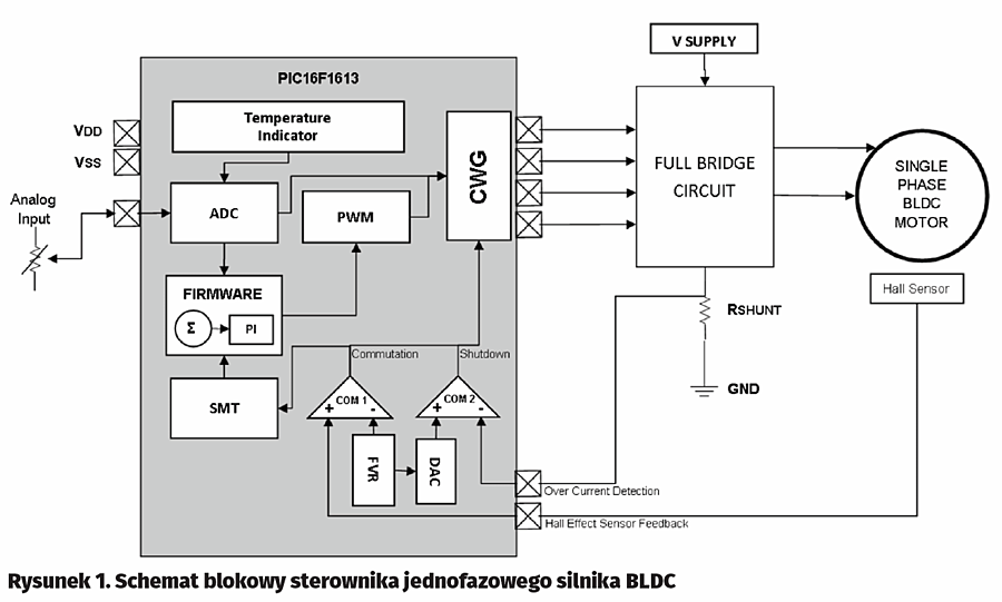 Na rysunku 1 pokazano sterownik jednofazowego silnika stałoprądowego wykonany z użyciem 8-bitowego mikrokontrolera PIC16F1613 firmy Microchip. Model ten został wybrany ze względu na małą liczbę wyprowadzeń oraz na wbudowane obwody peryferyjne, które mogą sterować zasilaniem silnika, mierzyć jego prędkość obrotową, a także przewidywać pozycję i obsłużyć wykrywanie usterek. W praktyce użyto następujących obwodów mikrokontrolera: