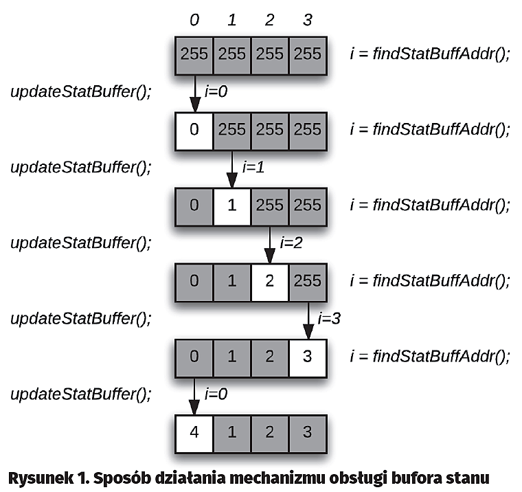 Jak wspomniano, na początku zakładamy, że wszystkie komórki bufora stanu mają tę samą wartość – w naszym wypadku 0xFF. W kolejnym kroku, rozpoczyna działanie funkcja findStatBuffAddr(), której zadaniem jest znalezienie bieżącego adresu, pod którym należy zapisywać kolejną kopię struktury danych. Funkcja ta każdorazowo przeszukuje cały bufor (od elementu nr 0 do n-1, porównując element poprzedni z bieżącym), więc pierwsze jej porównanie jest wykonywane na elementach numer 3 i numer 0. Wartość elementu numer 3 (0xFF) powiększona o 1 (0x00) jest różna od wartości elementu numer 0 (0xFF), funkcja zwraca adres 0x00. Program aplikacji powinien w tym miejscu zapisać kopię struktury danych pod adresem wlConfigBuff[0], a następnie wywołać funkcję updateStatBuffer(), której zadaniem jest aktualizacja bufora stanu, by kolejne przeszukiwania zakończone były wskazaniem poprawnego elementu. Ta aktualizacja polega na tym, że w miejscu bież?cego adresu w?buforze stanu (w?przypadku pierwszego kroku to?element ącego adresu w buforze stanu (w przypadku pierwszego kroku to element wlStatBuff[0]) jest zapisywana wartość poprzedniego elementu (w wypadku pierwszego kroku to element wlStatBuff[3], czyli wartość 0xFF) powiększona o jeden – w tym wypadku będzie to 0x00. Kolejne, analogiczne kroki pokazane na rys. 1 towarzyszące następnym zapisom kopii struktury danych powodują wskazanie kolejnych elementów bufora stanu i ich stosowną aktualizację, przy czym należy zauważyć, że po aktualizacji elementu o numerze 3 funkcja przechodzi z powrotem do elementu nr 0 i tak dalej.
