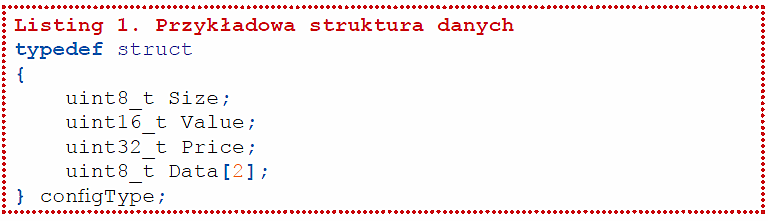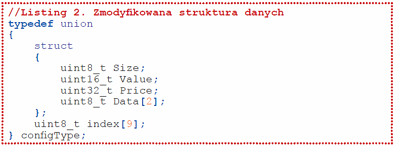 Załóżmy, że mamy pewien zestaw zmiennych aplikacji użytkownika, które cyklicznie musimy zapisywać w pamięci EEPROM, a które to zgrupowano strukturze danych pokazanej na listingu 1. Aby wygodnie było indeksować taką strukturę, która to przecież może zawierać pola o różnej długości, zamieńmy ją na unię przechowującą nasze dane pamiętając, że wielkość pola indexu tejże unii musi odpowiadać wielkości całej struktury. Nowy, zmodyfikowany w opisany powyżej sposób, typ danych pokazano na listingu 2.