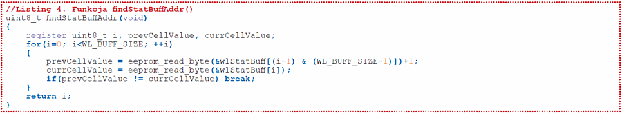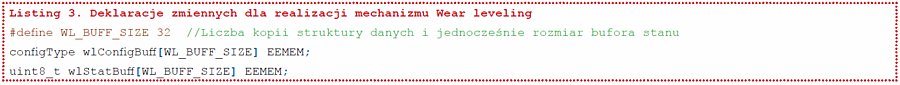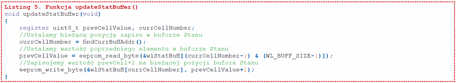 3. Aktualizacji wartości bufora stanu (zmiennej wlStatBuff) by następujące po sobie zapisy (po restarcie aplikacji) odbywały się kolejnych miejscach równoważąc tym samym zużycie pamięci EEPROM.