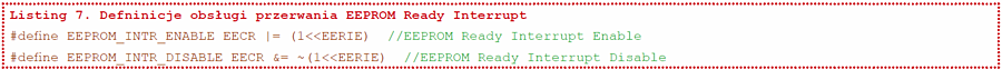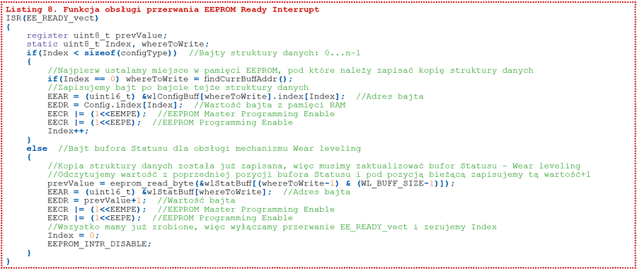 W pierwszym kroku wprowadzimy dwie definicje, które służą odblokowaniu i zablokowaniu przerwania EEPROM Ready Interrupt, a które to pokazano na listingu 7. Funkcję obsługi przerwania EEPROM Ready Interrupt pokazano na listingu 8. Cały proces zapisu kopii struktury danych i aktualizacji bufora stanu uproszczono do maksimum, a do tego w całości odbywa się on sprzętowo, w procedurze obsługi przerwania kontrolera pamięci EEPROM, co powoduje, iż mamy pewnoś?, ?e?inne procedury obs?ugi przerwa? systemowych nie spowoduj?, i??zainicjowany wcze?niej proces zapisu pami?ci EEPROM nie dojdzie do?skutku. Spos?b inicjowania operacji zapisu nowej kopii struktury danych oraz aktualizacji bufora stanu ogranicza si? on?do?uruchomienia przerwania ć, że inne procedury obsługi przerwań systemowych nie spowodują, iż zainicjowany wcześniej proces zapisu pamięci EEPROM nie dojdzie do skutku. Sposób inicjowania operacji zapisu nowej kopii struktury danych oraz aktualizacji bufora stanu ogranicza się on do uruchomienia przerwania EEPROM Ready Interrupt, które to inicjuje całą procedurę za pomocą polecenia EEPROM_INTR_ENABLE.