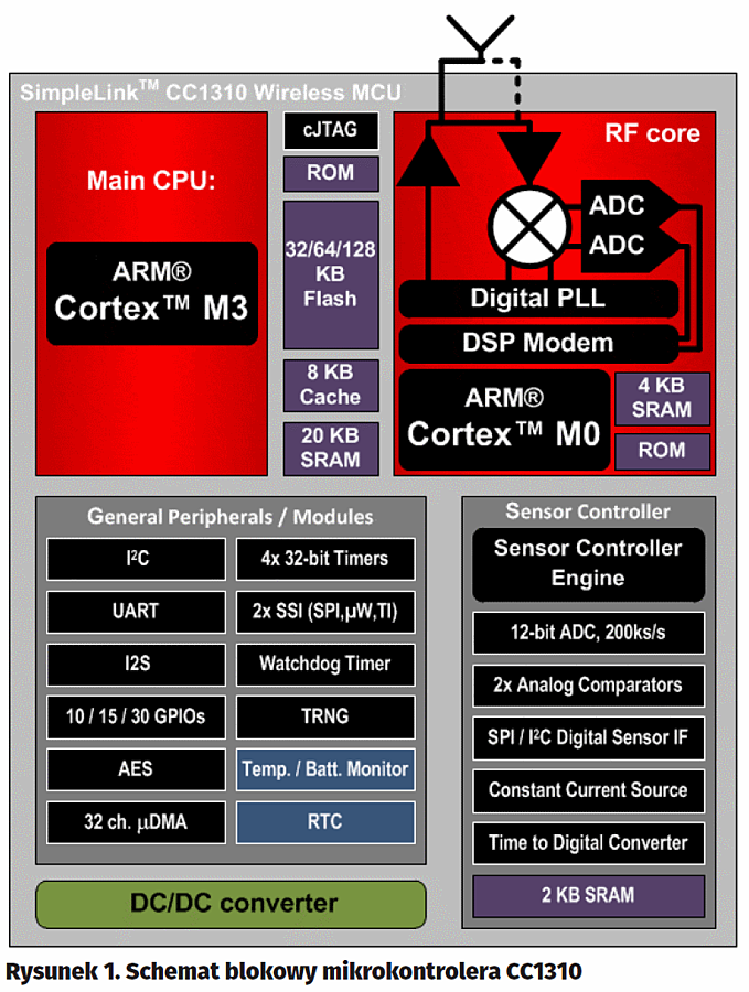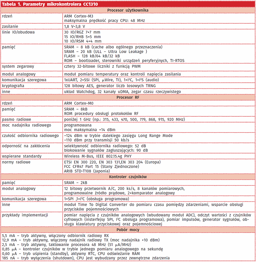 Mikrokontroler CC1310 posiada dużą moc obliczeniową (142 miejsce w zestawieniu CoreMark) a przy tym charakteryzuje się niskim poborem mocy (158 miejsce w zestawieniu ULPBench). Zintegrowany moduł radiowy zapewnia niezależną od jednostki centralnej CPU transmisję radiową. Moduł radiowy charakteryzuje się wysoką czułością odbiornika, niskim poborem mocy oraz tym, że posiada wbudowane mechanizmy zwiększające odporność na zakłócenia. Zintegrowany moduł kontrolera czujników pozwala wykonywać pomiary niezależnie od jednostki centralnej CPU mikrokontrolera. Możemy główny rdzeń CPU mikrokontrolera wprowadzić w tryb uśpienia i w tym samym czasie wykonać pomiary korzystając z kontrolera czujników. Następnie możemy obudzić jednostkę centralną CPU mikrokontrolera, aktywować radio, wysłać wynik pomiaru i ponownie przejść w tryb uśpienia. Taki schemat pracy pozwala maksymalnie zwiększyć czas pracy urządzenia na baterii. Szczegółowe parametry mikrokontrolera CC1310 w tym pobór mocy w różnych trybach pracy prezentuje tabela 1.