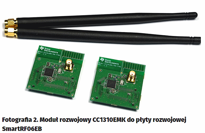 Mikrokontroler CC1310 jest przystosowany do pracy w trybie transmisji radiowej dalekiego zasięgu (tryb transmisji Long Range). Parametry zasięgu toru radiowego dla mikrokontrolera CC1310 determinuje moc nadajnika TX 14 dBm oraz czułość odbiornika RX –124 dBm. Korzystając z modułu LaunchPad (antena drukowana na PCB) uzyskamy zasięg transmisji w granicach 150…200 metrów (nadajnik i odbiornik w otwartym terenie bez przeszkód w linii transmisji radiowej). Dodatkowo, firma Texas Instruments w swoim portfolio posiada bogatą ofertę wzmacniaczy zasięgu radiowego (range extender). Do współpracy z mikrokontrolerem CC1310 jest przeznaczony wzmacniacz typu CC1190. Korzystając z modułu CC1190 możemy zwiększyć moc nadajnika CC1310 z 14 dBm do 27 dBm. W praktyce przełoży się to na zwiększenie zasięgu z setek metrów na kilometry. Możemy również zaprojektować urządzenie z zewnętrzną anteną. Przykład takiego rozwiązania prezentuje zaprojektowany przez Texas moduł rozwojowy CC1310EMK (fotografia 2). Po podłączeniu modułu CC1210EMK z płytą rozwojową SmartRF06EB możemy uzyskać zasięg transmisji radiowej nawet do 20 kilometrów.