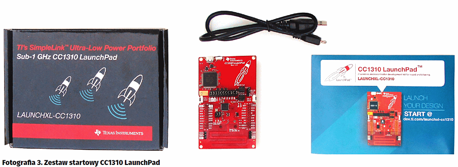 Zestaw startowy LauchPad z mikrokontrolerem CC1310 składa się z: płytki startowej LaunchPad, przewodu USB-A mikro-B oraz broszury informacyjnej. Zawartość zestawu pokazano na fotografii 3.