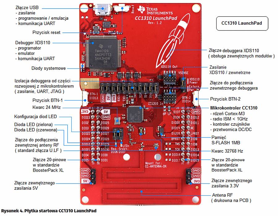 Najważniejszym elementem zestawu startowego jest płytka LaunchPad. Na płytce zainstalowano mikrokontroler CC1310 w obudowie RGZ o wymiarach 7 mm×7 mm. Poza mikrokontrolerem na płytce startowej LaunchPad umieszczono 3 przyciski (dwa użytkownika oraz jeden reset), 4 diody LED (2 użytkownika: czerwona, zielona oraz 2 systemowe), gniazdo USB (zasilanie, programowanie/emulacja, komunikacja UART przez USB), dwa złącza rozszerzeniowe 20-pinowe w standardzie BoosterPack XL. Płytka startowa ma zamontowaną kość pamięci S-FLASH o pojemności 1 megabajta. Moduł startowy Launchpad wyposażono w antenę PCB oraz złącze do podłączenia zewnętrznej anteny. Wygląd płytki startowej CC1310 LaunchPad pokazano na rysunku 4.