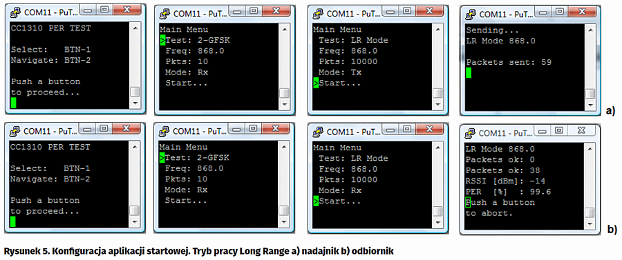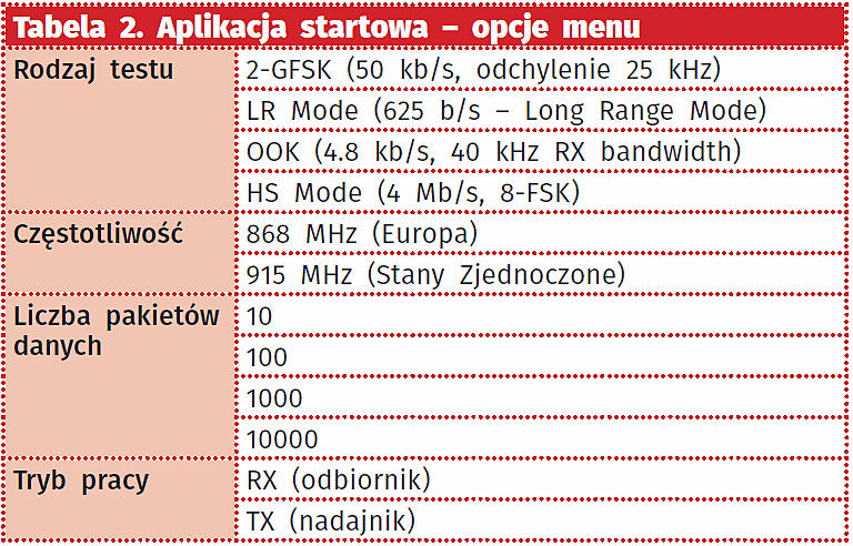 Płyta startowa CC1310 LaunchPad jest zaprogramowana aplikacją startową służącą do testowania jakości transmisji radiowej RF (transmisja pakietów, pomiar mocy odebranego sygnału RSSI, pomiar liczby niepoprawnie odebranych pakietów). Aplikacja jest uruchamiana po podłączeniu modułu do zasilania. Menu sterowania jest wyświetlane na ekranie LCD (należy podłączyć płytę rozszerzeń 430BOOST-SHARP96) oraz jest transmitowane na wyjście UART modułu (parametry transmisji 115200 b/s 8N1, bez kontroli parzystości). Opcje menu prezentuje tabela 2.